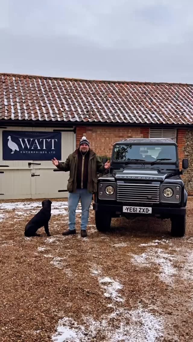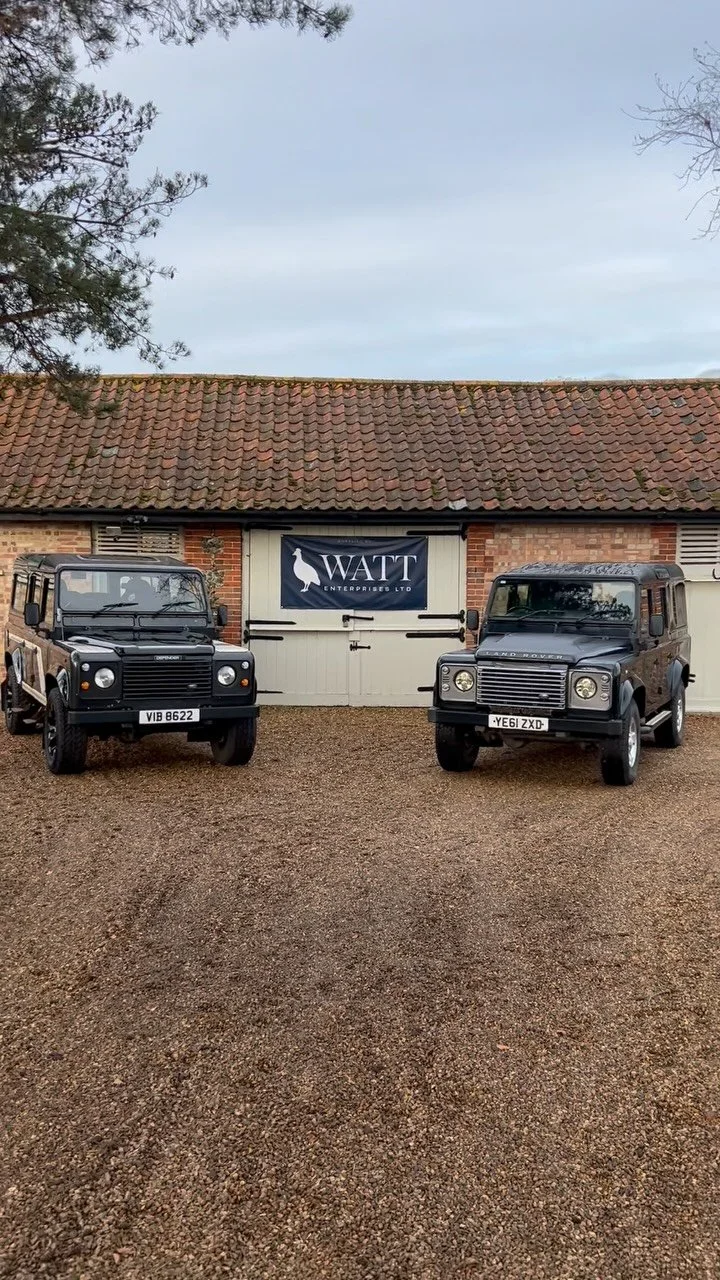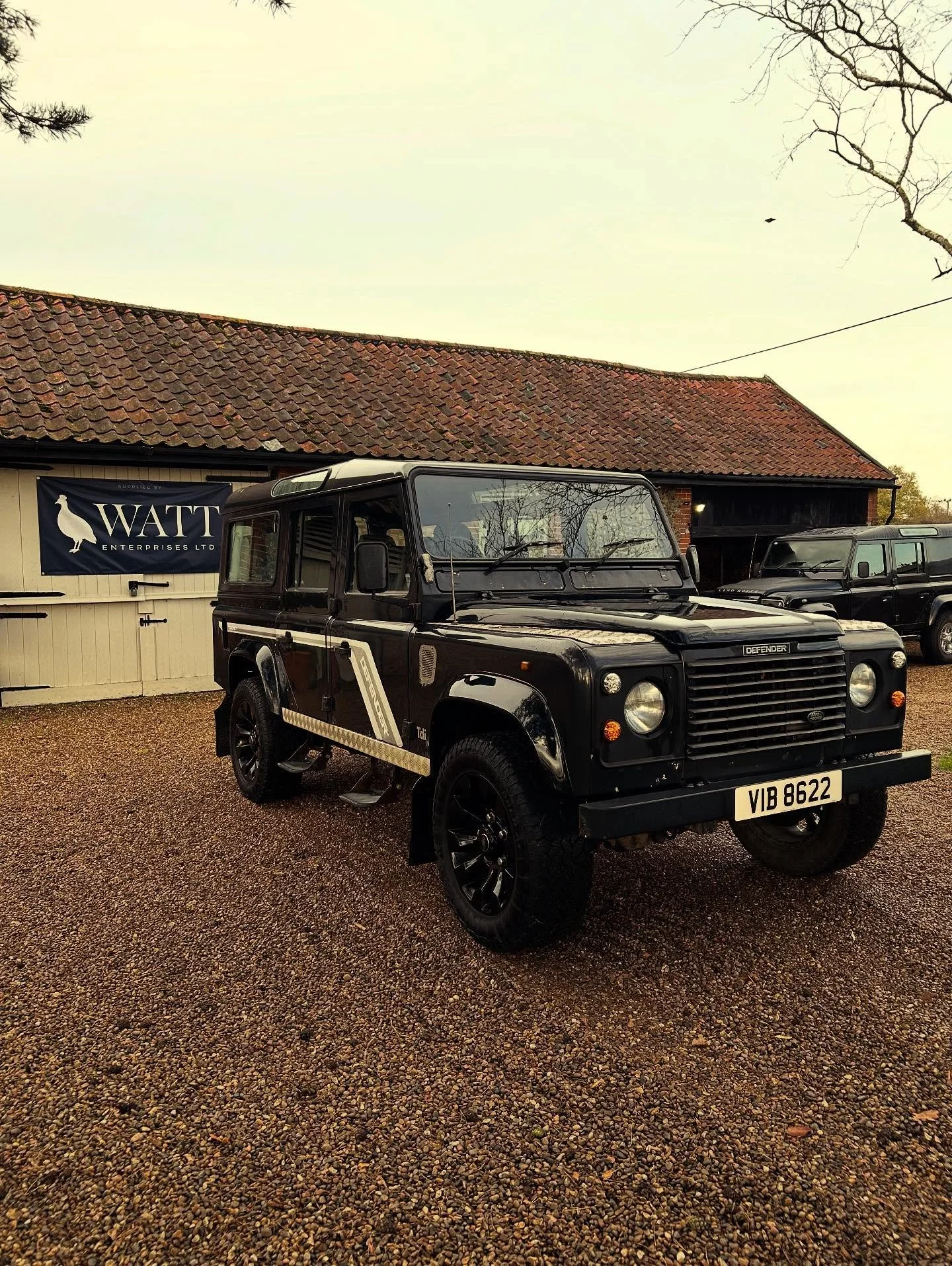 Two black Land Rover Defender vehicles parked in front of a white gate with a "WATT Enterprises Ltd" banner, and a black dog sitting between them.